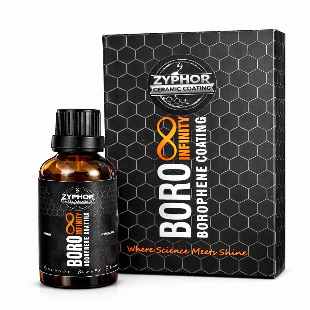 Zyphor ceramic coatings are engineered with advanced boron nano-particle technology that forms an ultra-durable hydrophobic layer on the surface of the paint. This protective structure reduces surface energy, causing water to form tight droplets that quickly roll away while carrying dirt and contaminants with them. The result is extreme water beading, rapid water sheeting, enhanced gloss, and easier maintenance for vehicles, caravans, and marine surfaces.